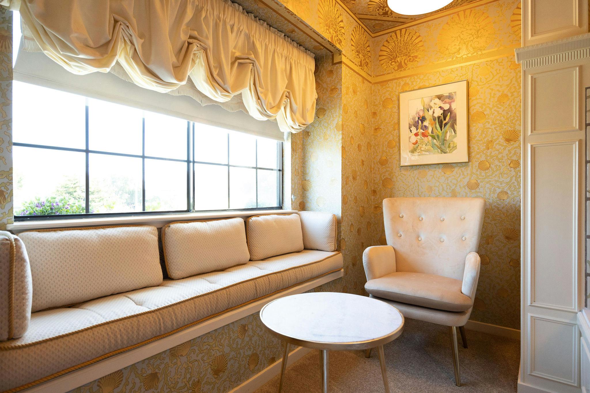 Spacious and private this 2nd floor room is in a quiet corner overlooking both of our gardens making this one of our most popular rooms. A king size bed faces a hand painted tile, marble fireplace and bay window sitting area. The luxurious bathroom includes an 8 foot vanity and a claw foot tub with brass shower.